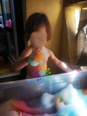 Après un bon quart d’heure à patouiller dans la mousse, la mélanger et l’écraser, elles m’ont demandé les jouets. C’est reparti pour un long moment de jeux.