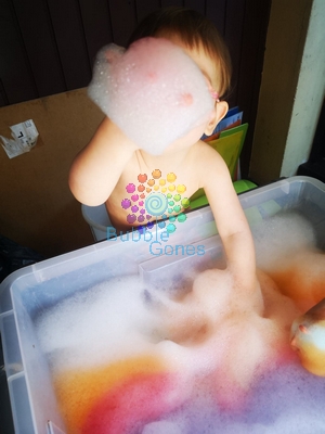 Chloé et Manon adorent l’eau et prendre des bains. Mais ce qu’elles adorent le plus c’est quand celui-ci est plein de mousse colorée. Du coup ça m’a donné une idée pour réaliser un nouveau bac sensoriel spécial été.