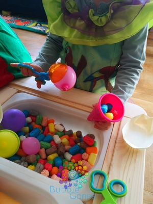 Les bacs sensoriels (panier à trésors ou mini monde) sont une manière ludique de travailler la motricité fine tout en s’amusant. En effet en transvasant, l’enfant va travailler sa préhension, la pince, renforcer les muscles de ces doigts et sa main tout en développant son agilité. Il va aussi travailler sa coordination des doigts, ainsi que celle oeil/main. De plus, c’est la possibilité de développer sa curiosité et son imagination en proposant des bacs autour d’un thème. C’est l’occasion d’enrichir son vocabulaire