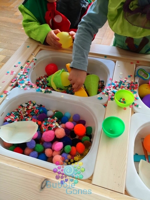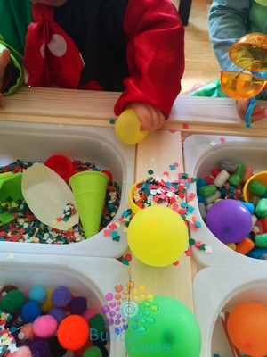 J’ai mis les confettis, pompons, playmais et ballons dans des bacs séparés. J’ai installé sur le contour de la table les différents ustensiles de transvasement.