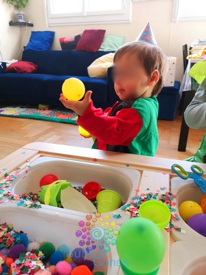Mais les petits ballons les ont passionné aussi, les prendre, les malaxer, tenter de les écraser, de les éclater. Mais ces petits ballons sont résistants et coquins, ils sautent des mains.