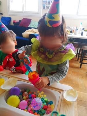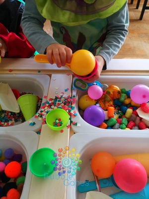 - matériel de transvasement : soucoupe, cornets à glace, pinces à boule, grosses cuillères, bonnet de clown