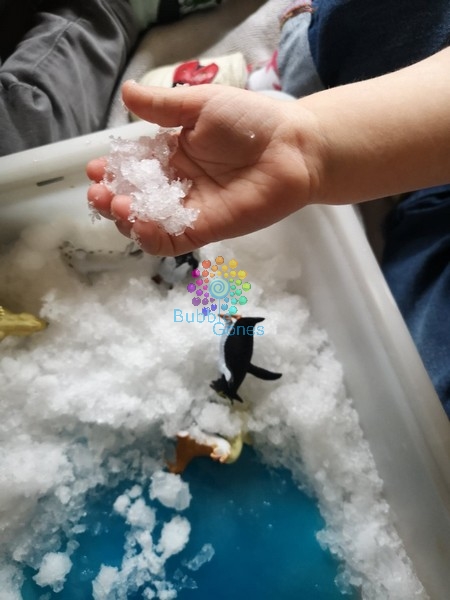 Avec ce deuxième bac, on découvre la texture de la neige : son côté manipulable et friable, avec un côté un peu froid, mais pas trop.