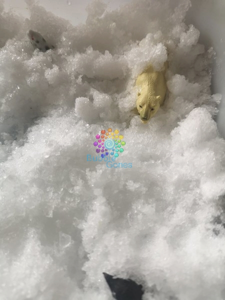 J’ai transvasé cette neige dans un petit bac et j’ai mis dans la neige des animaux de la banquise. J’ai place ce bac sur une table. Je vous conseille une nappe car les enfants risquent d’en mettre à côté, et la neige se transforme en poudre lorsqu’elle sèche.