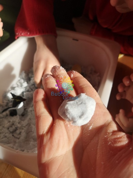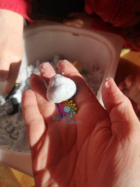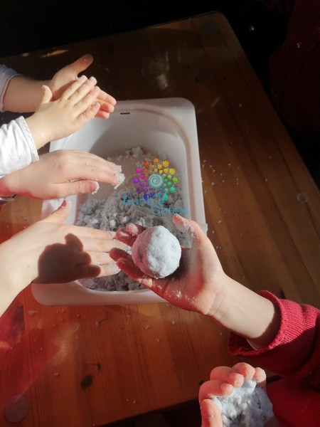 Cette neige maison est géniale, elle est manipulable à souhait : on peut réaliser des boules, l’applatir, l’émietter… Elle est froide et ressemble vraiment a de la neige.