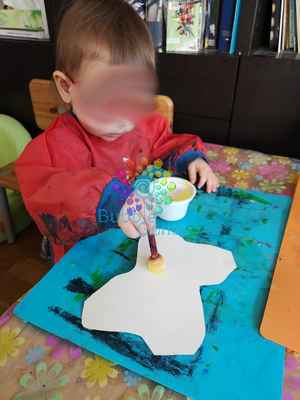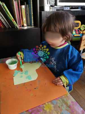 Miss L et mademoiselle A ont choisi leurs peintures. Elles ont choisi du jaune et du vert. Je les ai préparé en les diluant avec un peu d’eau et de peinture blanche. Elles vont peindre ces futurs ballotins avec des tampons.