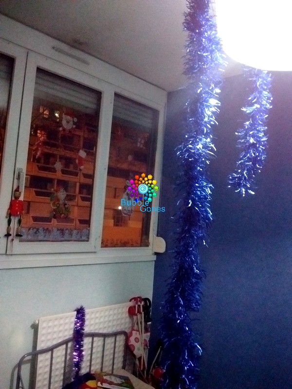 Nous n’avons pas eu le temps de tout décorer l’appartement, alors Farfelu et Pirouette ont voulu décorer la salle de jeux des filles. Pauvre Pirouette, elle s’est endormie dans les guirlandes