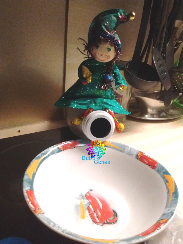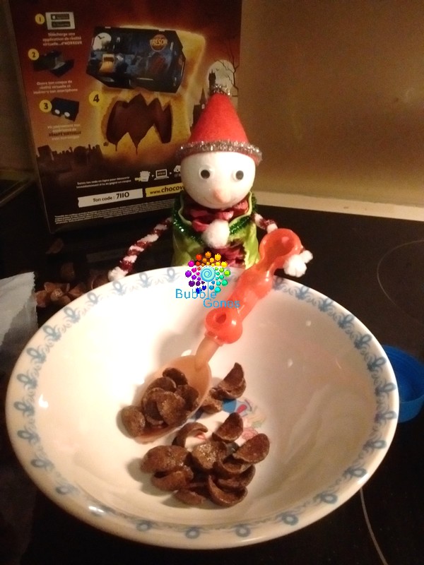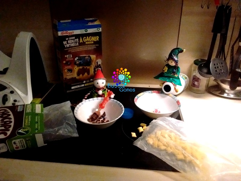 Aujourd’hui, nous étions de sortie chez des amis pour fêter l’anniversaire de leurs trois filles. Nous sommes rentrés tard et les filles s’étaient endormies en voiture. Donc elles n’ont pas pu préparer le repas des lutins. Mais vous inquiétez pas les lutins ne se sont pas laisser mourir de faim. Ils ont été dans la cuisine et se sont servis dans les céréales des filles.