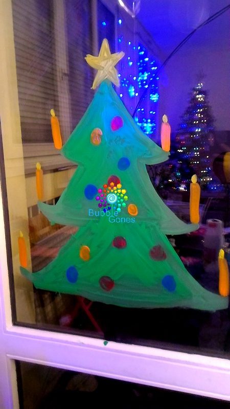 J-2 avant l’arrivée du Père Noël, Pirouette vient de se rendre compte qu’il n’y a pas de cheminée pour qu’il puisse venir déposer les cadeaux sous le sapin. Du coup, elle m’a emprunté de la peinture et elle a tagué la baie vitrée :