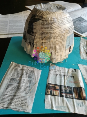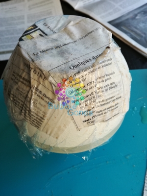 J’ai découpé des bandes de papier journal. J’ai huilé le bol et je l’ai enveloppé de cellophane pour le démouler plus facile.