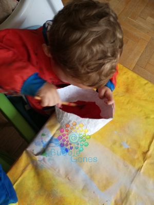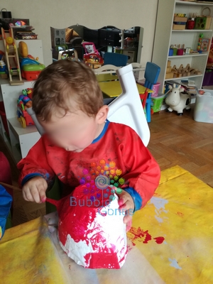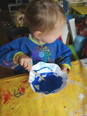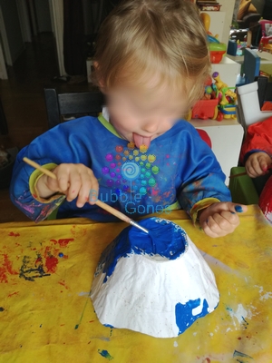 Une fois le bol bien sec, les loulous les ont peint avec de la gouache. Attention à ne pas la diluer avec trop d’eau : cela pourrait ramolir le bol. Hugo va réaliser une belle fleur bleu et Jeanne un coquelicot.