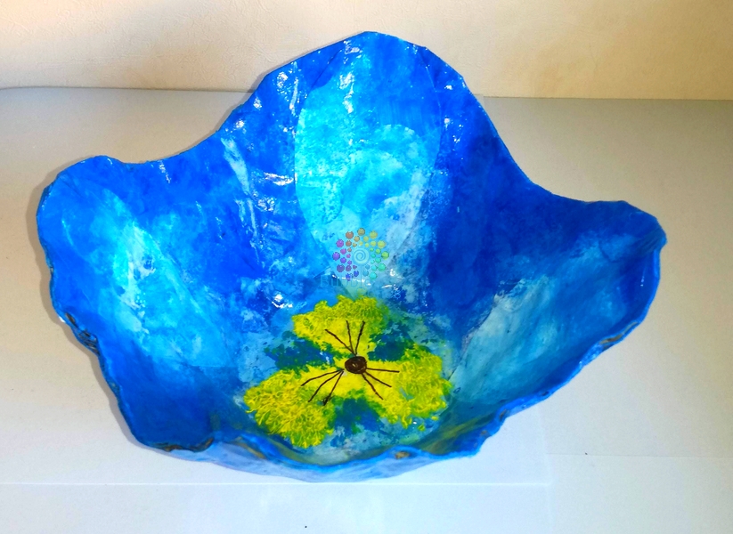 Une fois la peinture sèche, j’ai vernis l’intérieur du bol pour le renforcer et donner un effet satiné au bol. Puis j’ai aidé les petits à réaliser le coeur de la fleur que j’ai collé grâce au vernis colle.