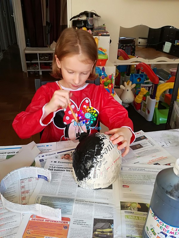 Pour cette année, je propose aux filles de réaliser un panier en papier mâché selon le thème de leur choix. Chloé allant se déguiser en chauve-souris, elle a décidé de rester sur ce thème. Manon a choisi une sorcière.