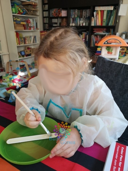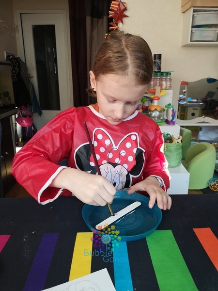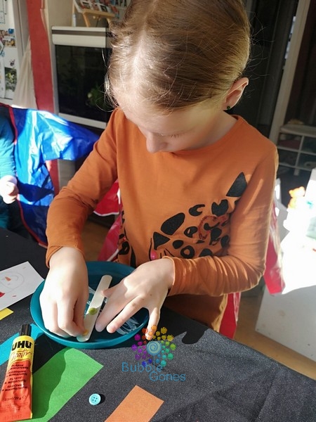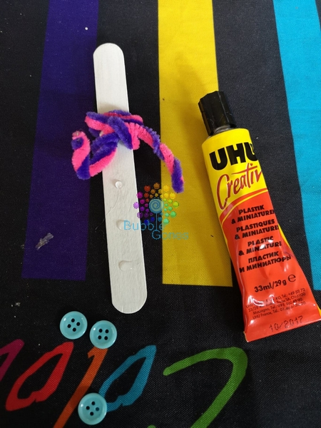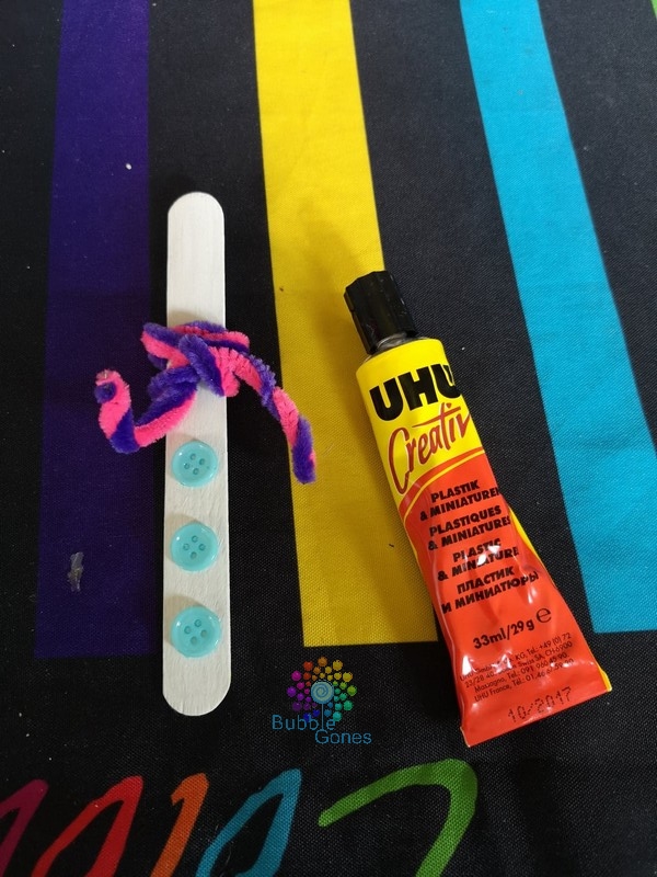Une fois la peinture sèche, j’ai déposé des gouttes de colle UHU créativ’ et j’ai collé mes trois boutons sur le bas du bâtonnet.