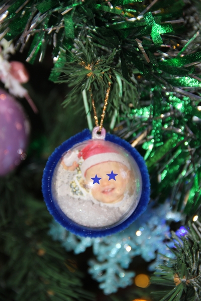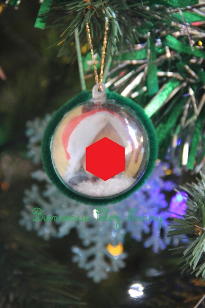 Lors d’une visite et séance photo à la part dieu devant les déco, j’ai gardé des belles photos des petits. Je les ai recadré et imprimé. Je les ai inséré dans la boule et j’ai rajouté des paillettes dedans. J’ai collé au tour un cure pipe.