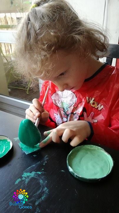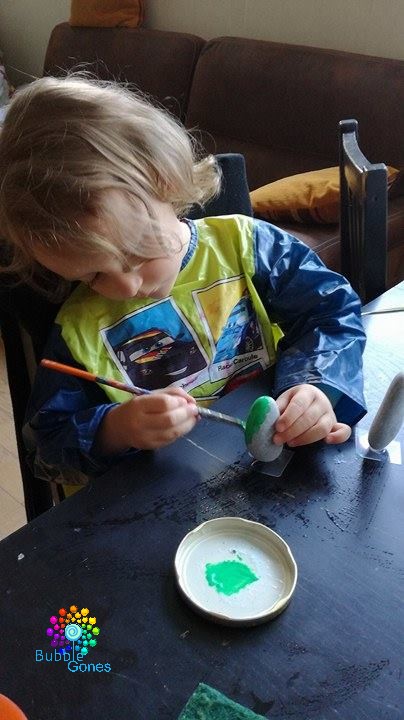 J’ai préparé différents dégradés de vert et les filles ont peint direct sur les cailloux bruts et propres. Avec le recul, j’aurais du mettre une sous couche dessous ou peindre avec de l’acrylique, car la peinture s’est un peu écaillée sur le côté. Les filles ont mis deux couches de peinture pour que la couleur soit profonde.