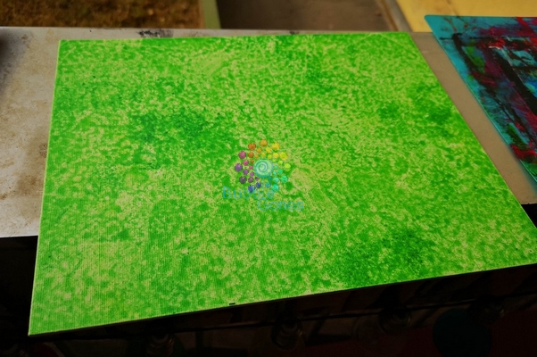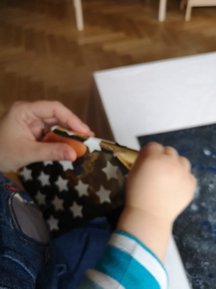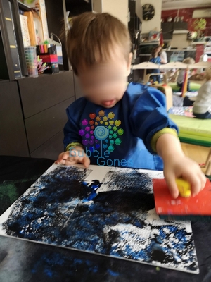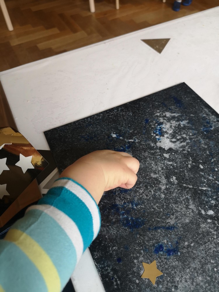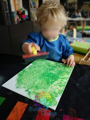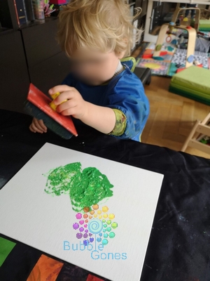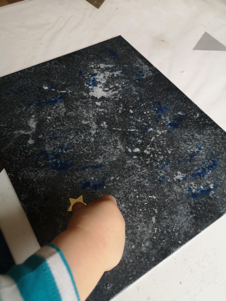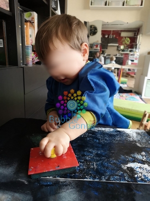 Mister L a choisi les étoiles et N les animaux. Pour la forêt, j’ai déposé des filets de peinture verte sur le gros tampon et N a tamponné toute la toile.