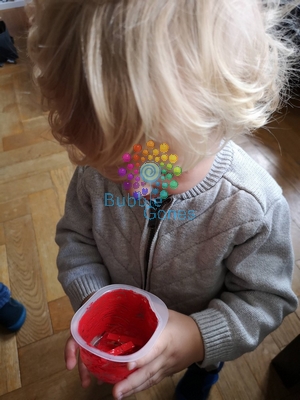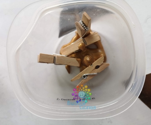 on a peint les petites pinces en bois. Comme c’est galère à peindre pour des petits, voici mon astuce : mettez les pinces dans une boite en plastique avec de la peinture et secouez bien !!!