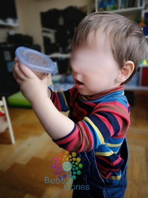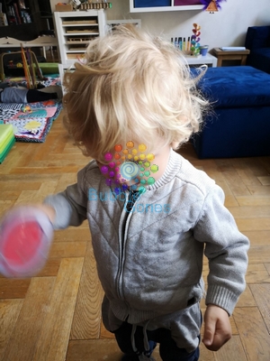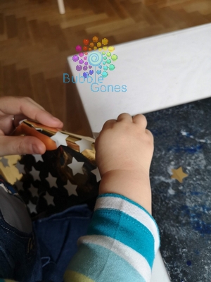 J’ai décollé les gommettes et je les ai mis sur le rebord de la table pour qu’il puisse les prendre et les coller sur le tableau.