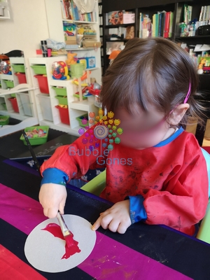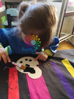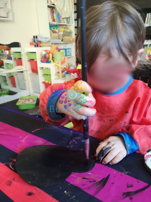 J’ai reproduit et découpé le modèle sur la boîte de céréales. Les puces ont peint en noir le corps. Pour le rond qui va se transformer en aile, l’une l’a peint en rouge, l’autre en jaune pailleté.