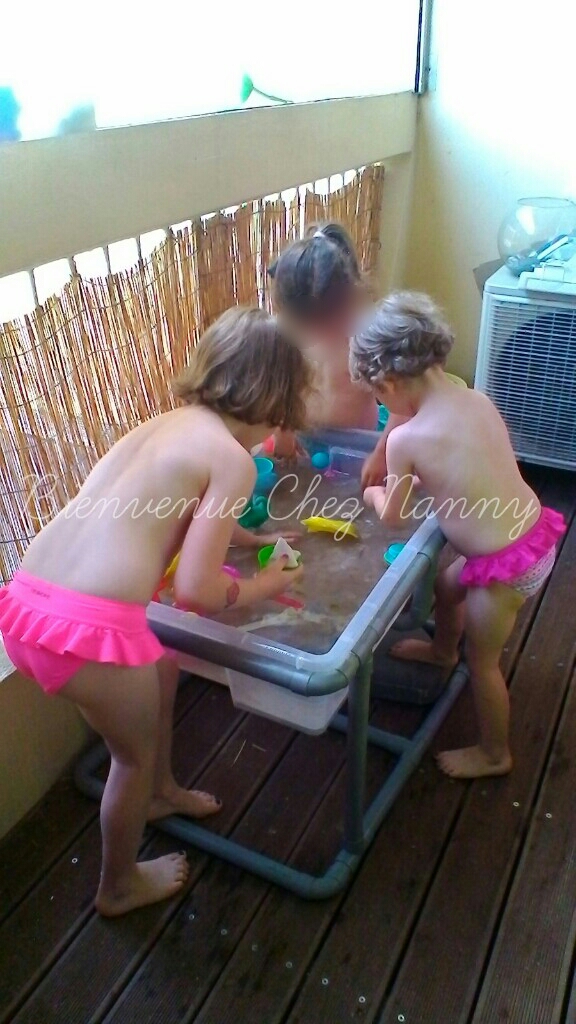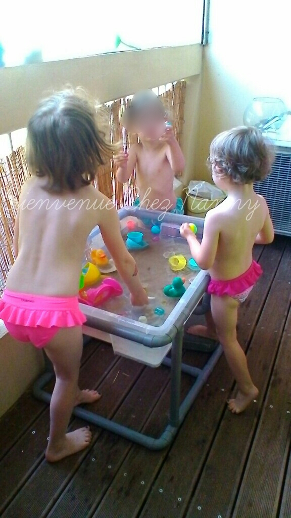 Pendant le goûter des filles, j’ai sorti la table sur le balcon et j’ai rempli le bac d’eau.