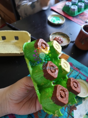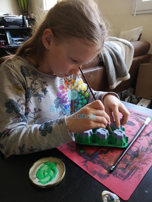 Chloé et moi, on a peint l’envers de la boîte en vert sauf le haut des alvéoles que l’on a peint en marron, une fois le verrt sec. Attention à ne pas faire des bords irréguliers.