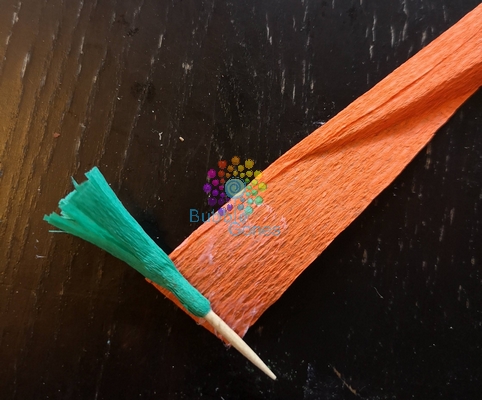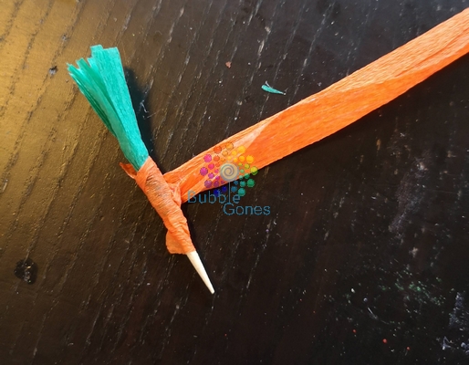 Une fois fait, on a découpé 6 bandes de papier crépon orange de 1 cm sur 8cm environ. Sur le même principe que pour la tige de la carotte, j’ai fait de même pour le corps. J’ai commencé à entourer le papier crépon autour de la tige, puis je l’ai replié sur elle même pour donner un peu plus de corps à la carotte.