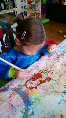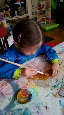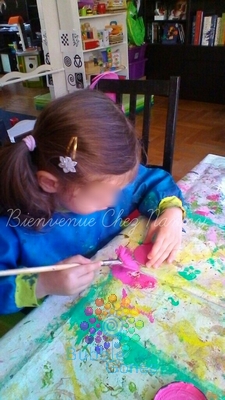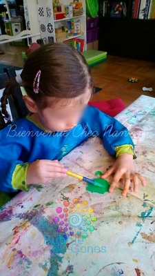 Une fois les parfums choisis (et du coup le nombre de boules), j’ai découpé les formes pour les boules de glace ainsi que pour le cornet. Lou les peint :