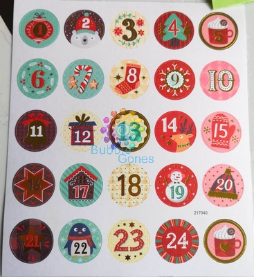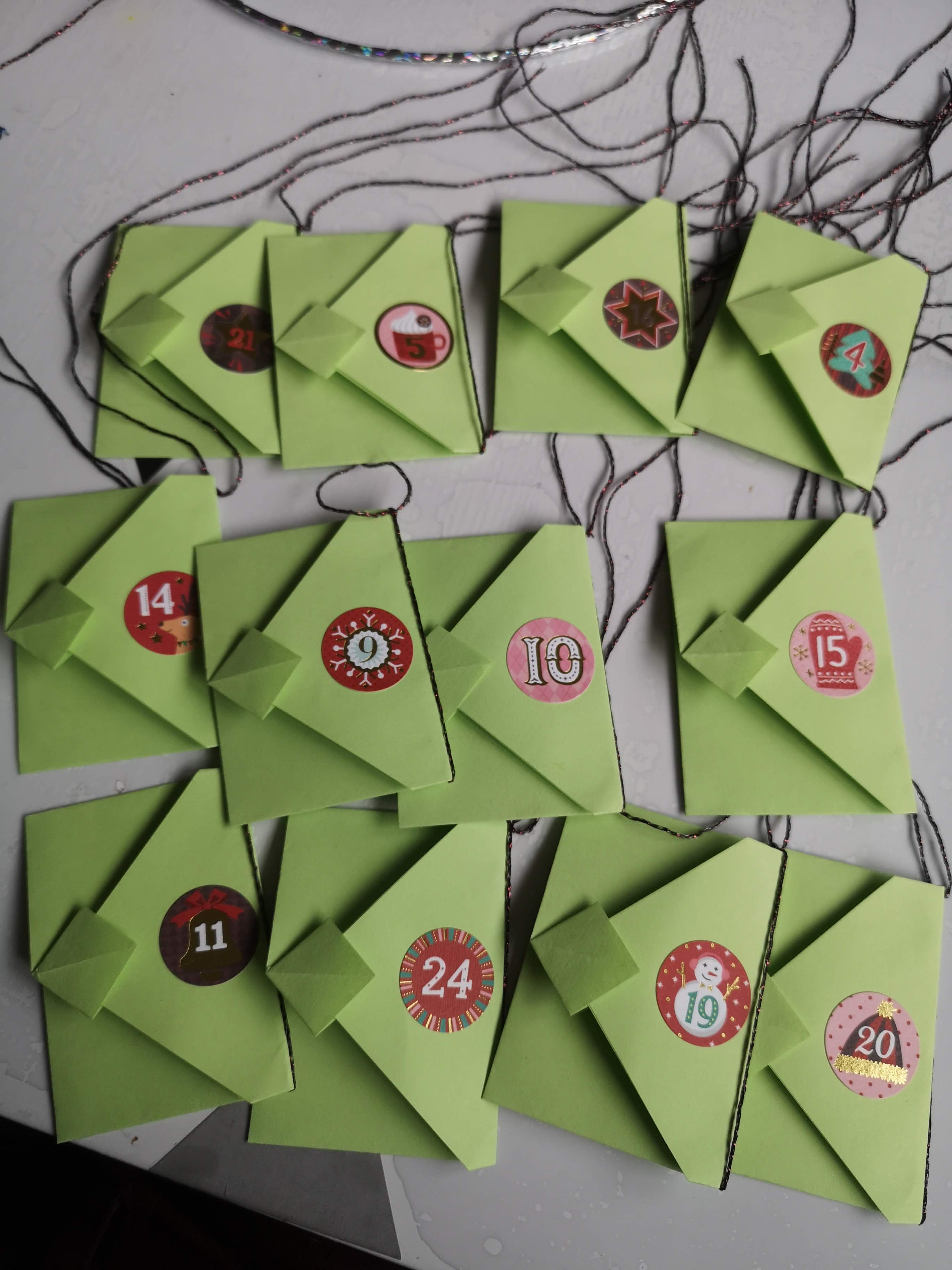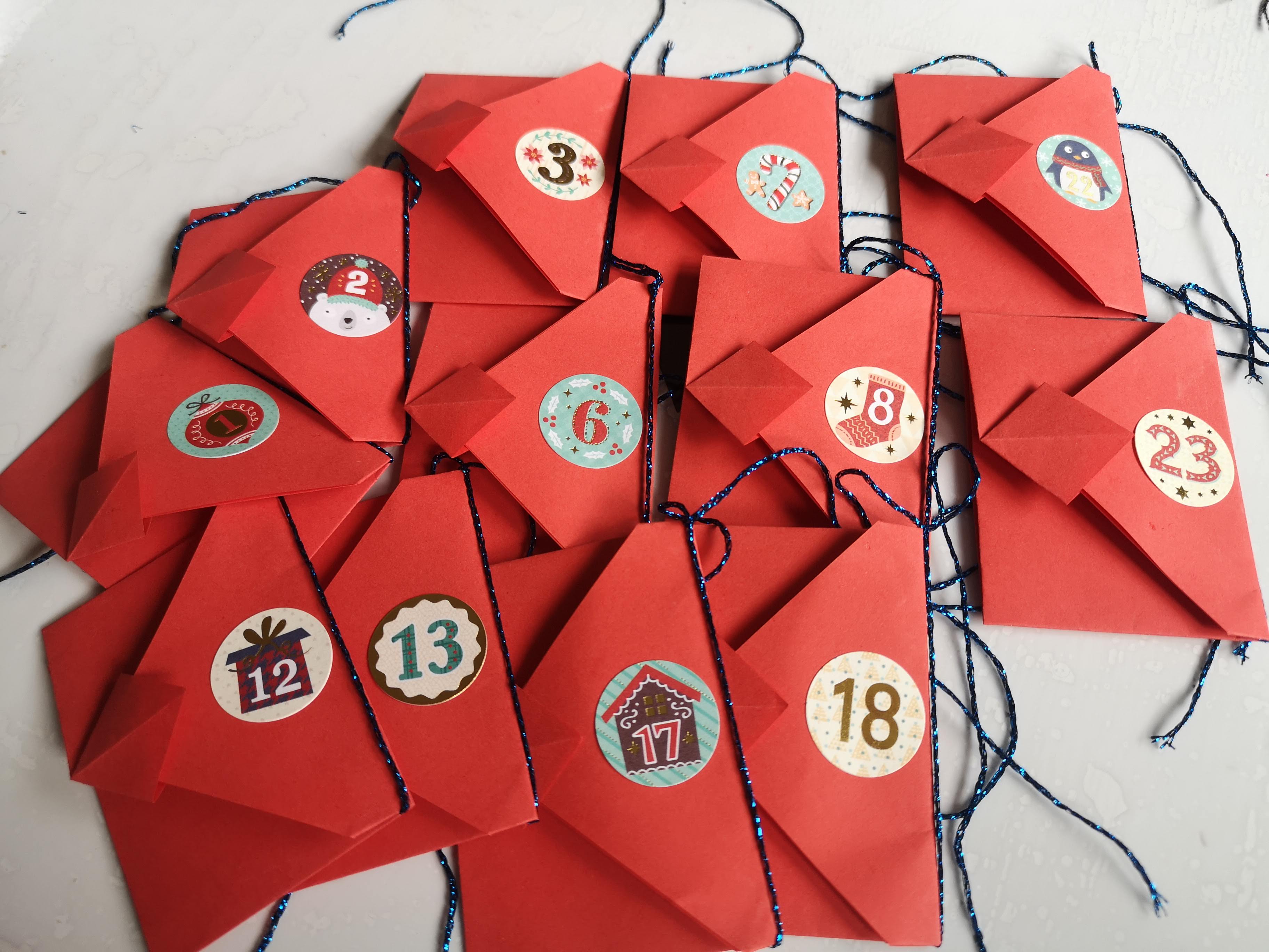 Une fois les enveloppes montées, j’ai glissé les bons de Noël dans chaque enveloppe (vous pouvez les imprimer par ICI). L’enveloppe tient bien fermé grâce à l’encoche. J’ai mis mes petites gommettes achetée à Lidl pour noter les numéros.