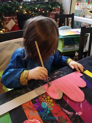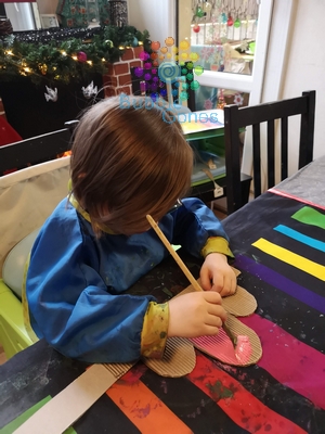 Mademoiselle A a choisi sa couleur préféré : le rose. Et oui une couronne ça peut être rose… Elle s’est appliqué à étaler la peinture sur toute la future couronne.