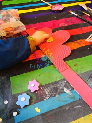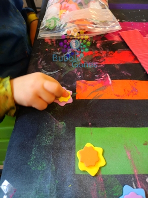 Mes formes en mousse ne sont pas autocollantes, du coup, je mets des petits carrés de mousse derrière pour que mademoiselle A puisse les coller.