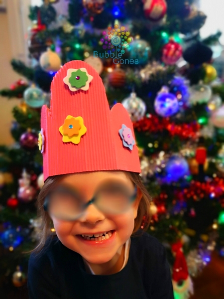 Je lui propose de rajouter des petits diamants au centre. Elle choisit les couleurs et je les colle (ils sont petits c’est une vraie galère à manipuler). J’ai pris la mesure de la tête avec la couronne afin d’ajuster au mieux la couronne sur la tête de mademoiselle A. Elle est trop fière avec sa couronne, elle n’est pas trop belle :