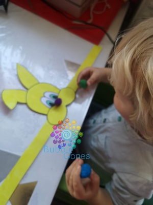 j’ai collé les différents éléments pour réaliser la couronne du Lapin de Pâques.