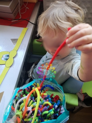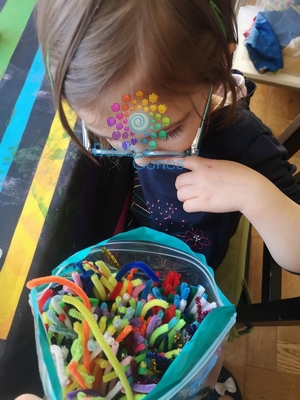 Chaque enfant a choisi la couleur du pompon pour réaliser le museau ainsi que les fils chenilles pour les moustaches. J’ai sorti les gros sacs et le plus dur a été de choisir la bonne couleur :
