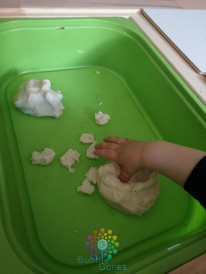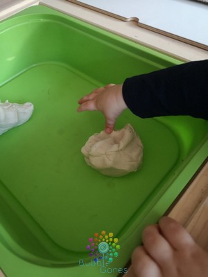 J’ai mis la pâte dans un bac sur ma table ikea et je les ai laissé découvrir cette texture. Ils l’ont malaxé, enfoncé leurs doigts, l’écrasé, la déchiré…. Mais bizarrement pas la gouter ^_^ c’est pas drôle, car j’adore la tête que font les enfants quand ils se rendent compte que c’est salé.