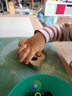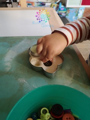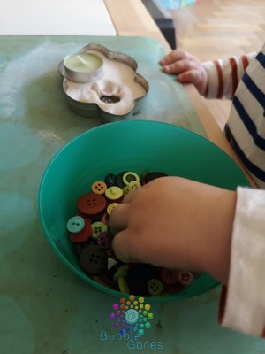 Ils ont bien compris ce que j’attendais d’eux, ils ont bien transféré les boutons du bol au nuage un par un. J’ai du juste leur demander de bien enfoncer les boutons dans la pâte, histoire qu’ils ne se détachent pas lorsque la pâte sèchera.
