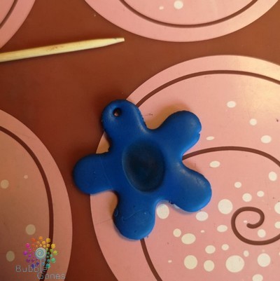 A l’aide d’un cure dent j’ai réalisé un trou sur le côté ce qui me permettra d’enfiler l’anneau pour le porte clef.