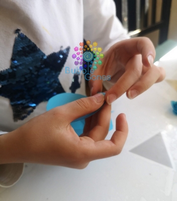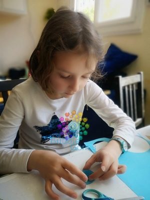 Les filles et moi on a découpé le cercle et la spirale. J’ai donné un coup de ciseaux sur le bord intérieur de la spirale pour l’onduler. Puis on a entouré la spirale sur elle même.