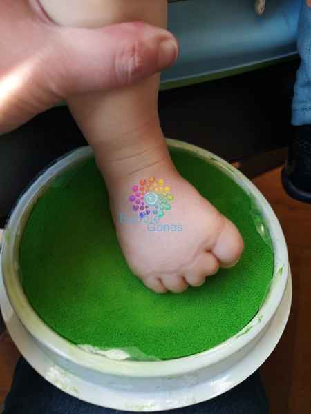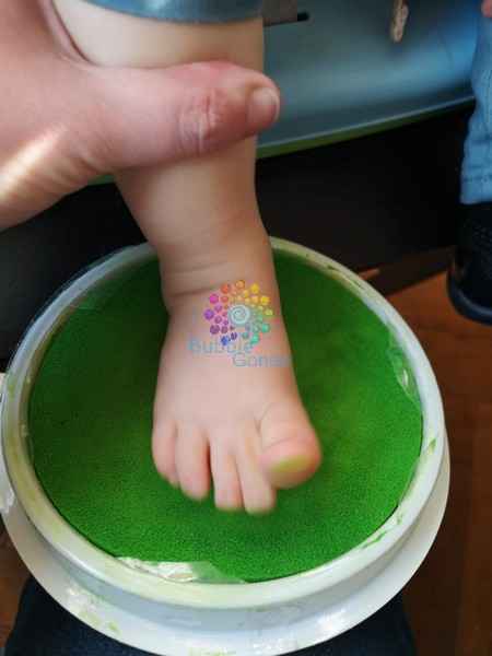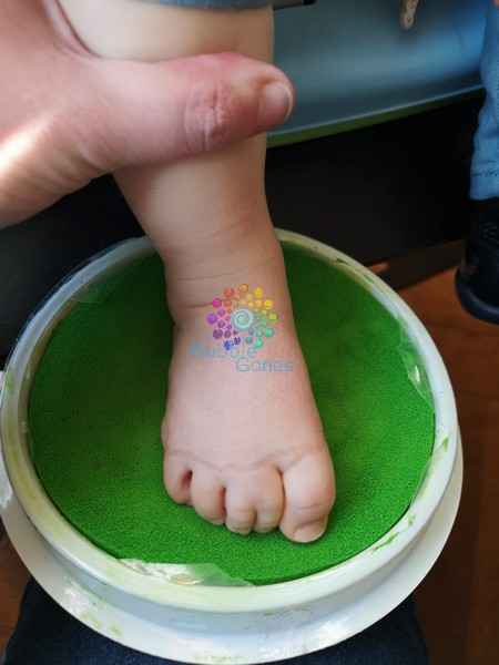 Puis je pose le pied ou la main de l’enfant sur le tampon (j’ai toujours eu de la chance car j’ai eu des enfants qui ne craignaient pas cette texture, ni celle de la peinture, car le but n’est pas de traumatisé l’enfant en réalisant ce cadeau).