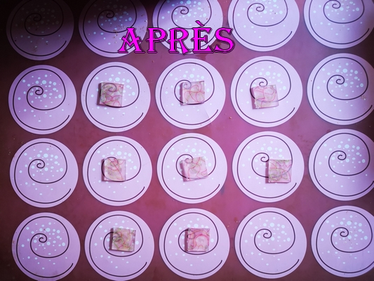 Avant de mettre au four, il faut bien penser à faire les trous, car une fois le plastique dur ça ne sera plus possible. Chloé a choisi de faire des losanges plutôt que des carrés, du coup, on a troué au niveau des angles du carré. J’ai trouvé deux trous sur 6 carrés et un trou sur les deux derniers restants.