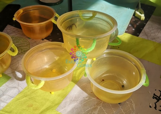 Avec baby L, j’ai des plats tout prêt dans des pots en plastique arrondis : la forme parfaite d’un futur petit chaudron.