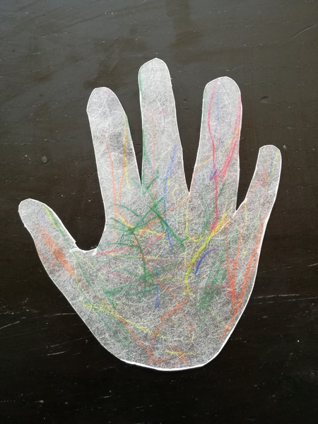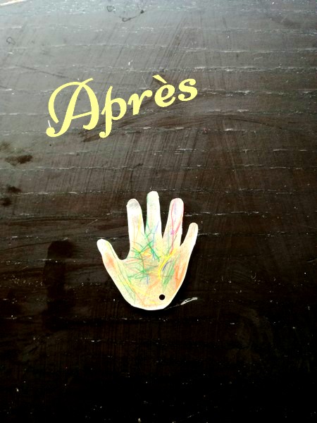 Hugo a posé sa main sur le plastique fou et j’ai dessiné son contour au crayon à papier. Je l’ai découpé (vous pouvez retrouver par ICI nos autres créations en plastique fou).