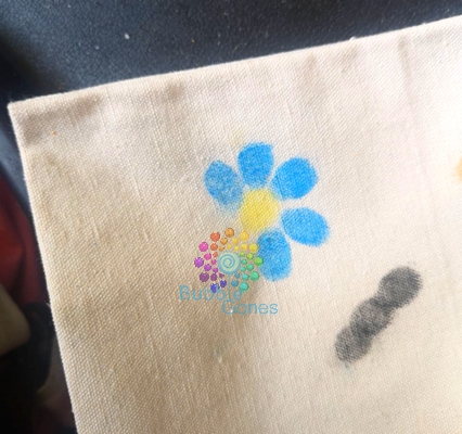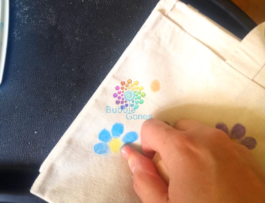 J’ai réalisé ces tableaux en deux fois, car cela demande un peu de temps et la patience des filles n’est pas très importante. Pour réaliser ces tableaux, il suffit de déposer le bout de l’index sur l’encreur et de poser le doigt sur le tissu.
