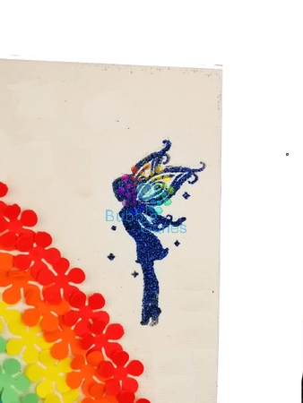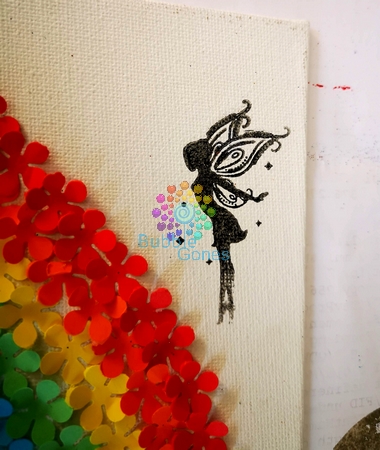 Une fois l’arc en ciel monté, je trouvais le tableau un peu vide. Les filles sont fans de magie, de fée et de sorcière. Du coup, j’ai choisi une petite fée à mettre sur ce tableau. Comme les filles sont fans de paillettes, je vous montre comment réaliser une empreinte brillante.