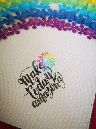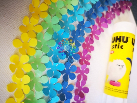 J’ai hésité entre plusieurs perforatrices pour réaliser cet arc en ciel. J’étais partie sur un nuage, mais pas de bol, je n’en ai pas ! J’ai hésité entre des petites fleurs et des étoiles, et j’ai préféré les fleurs car j’ai envie de volume pour ce tableau et ça serait plus simple de replier des pétales.