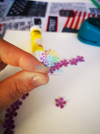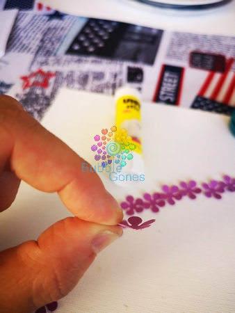 J’ai utilisé la colle en bâton pour coller mes petites fleurs, étant une colle solide, elle ne déforme pas le papier. J’ai déposé un ruban de colle sur mon quart de cercle