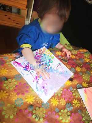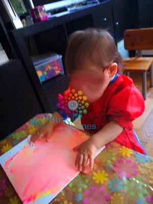 Mademoiselle A et Miss L adorent mettre les mains à la pâte ^_^ ou plutôt les deux mains dans la peinture ! Comme elles se tiennent bien debout, on fait de plus en plus d’atelier sur la petite table.