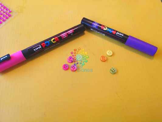 Mais qu’importe, grâce aux feutres posca, je change la couleur de mes boutons comme je veux ! Un coup de feutre, de vernis, et mon bouton vert devient violet :