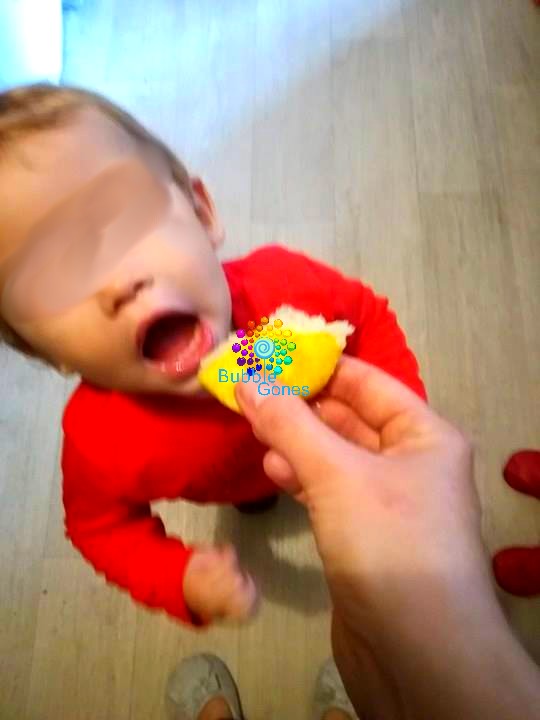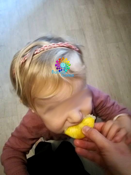 Un citron était en train de me faire de l’oeil, du coup je commence à le couper et a le presser pour récupérer le jus. Hugo et Jeanne me tirent pas le tee shirt “Nanny… Nanny…” Rho ces deux coquinous, du coup, je leur tends le citron et comme deux fous, ils croquent directement dedans !!! Je me dis qu’ils vont me maudire… Et bah non même pas, j’ai eu le droit à un “HHuuummm !! ”