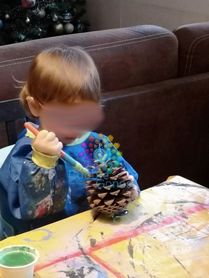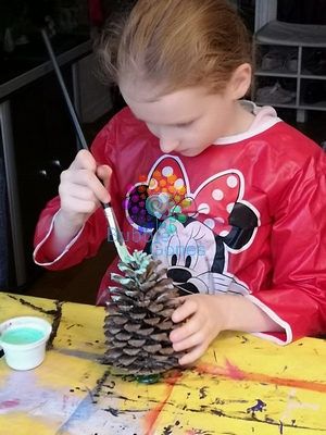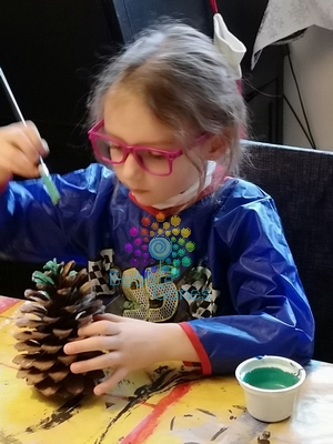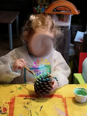 J’ai donné des pinceaux assez gros et aux longs poils pour qu’ils puissent se faufiler dans la pomme de pin. Les filles se sont super bien appliquées pour peindre leur futur sapin et le résultat a été bluffant. Elles sont restées près de 10 minutes à peindre avec application.